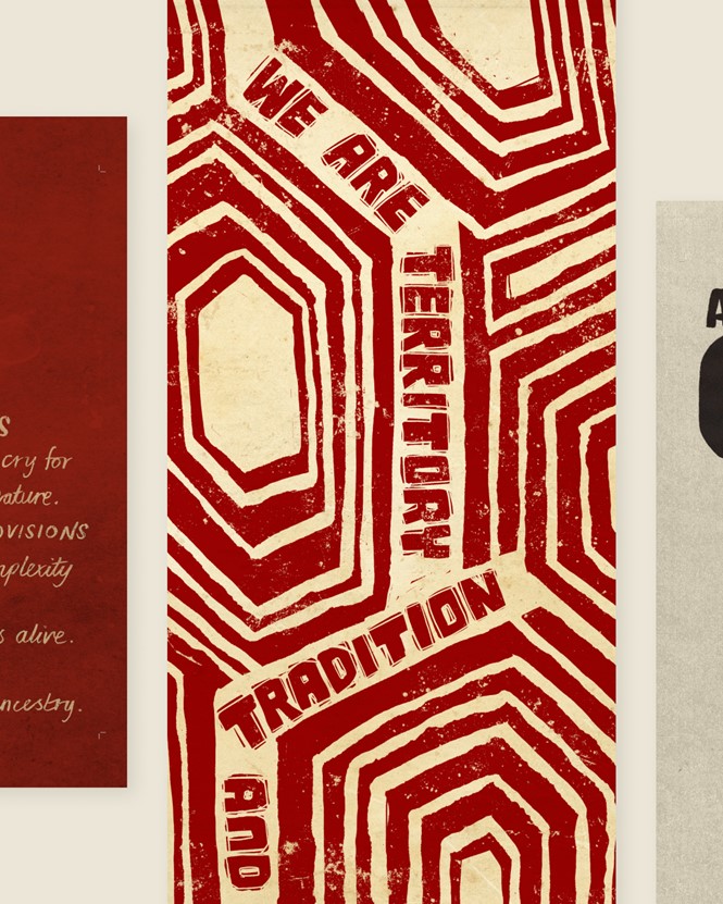 The banners with their repeated slogans, bold colours, handwritten fonts and ideologies symbolised through illustrations by Mishka Westell are a recognisable form of protest art. The red colour is based on the paint from the Ucurum plant that Brazilian Indigenous peoples use to dye their skin. “Smikra Wahikwa” is “a celebration of the ancient methods of communication that have been at the helm of transforming our world throughout history,” explains activist and artist Samantha Roddick, member of Choose Earth Collective. “One of those methodologies is how we collectively come together and rise through our own value system.” Protest is a form of collective communication that’s been repeated throughout history.