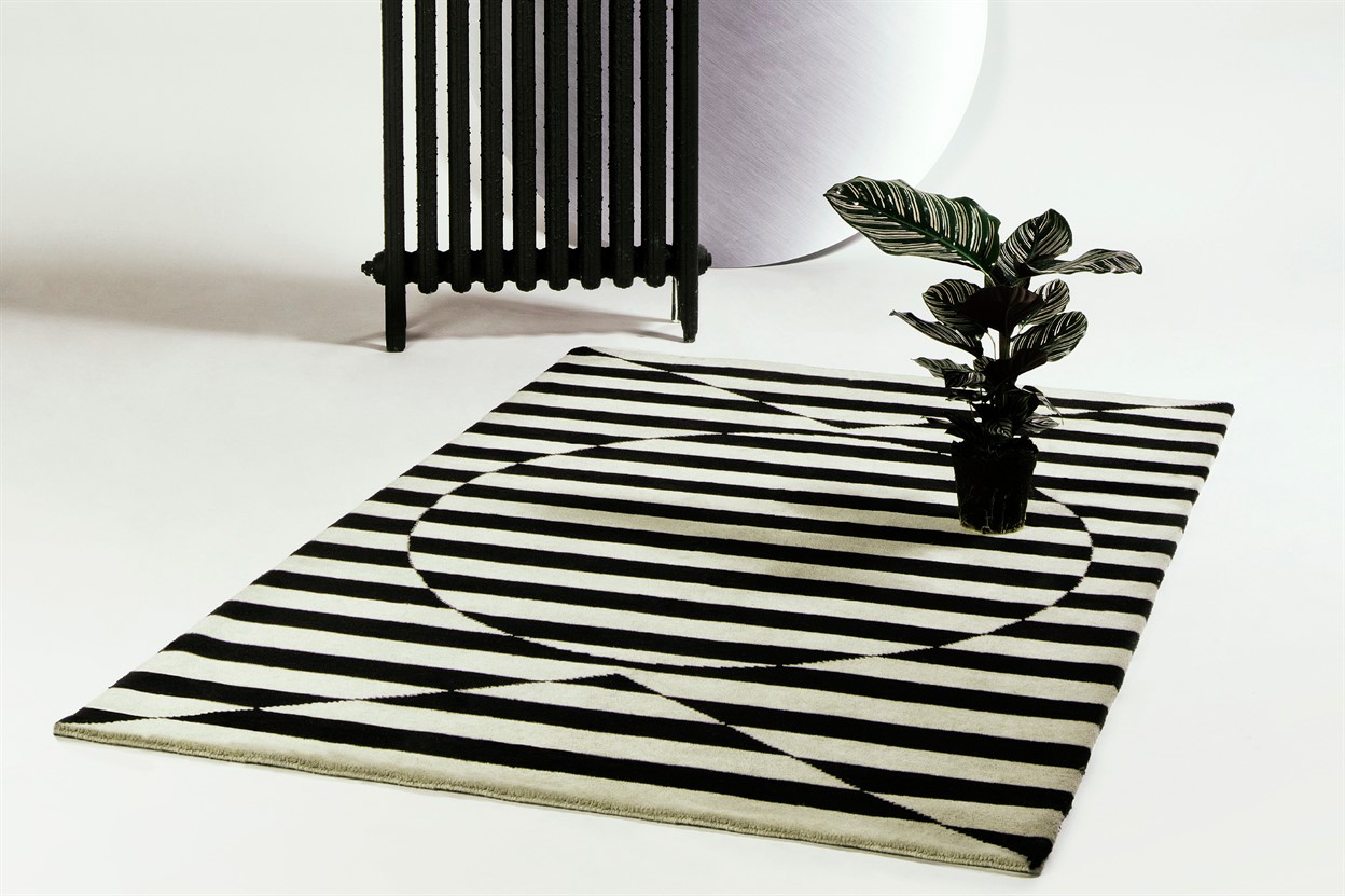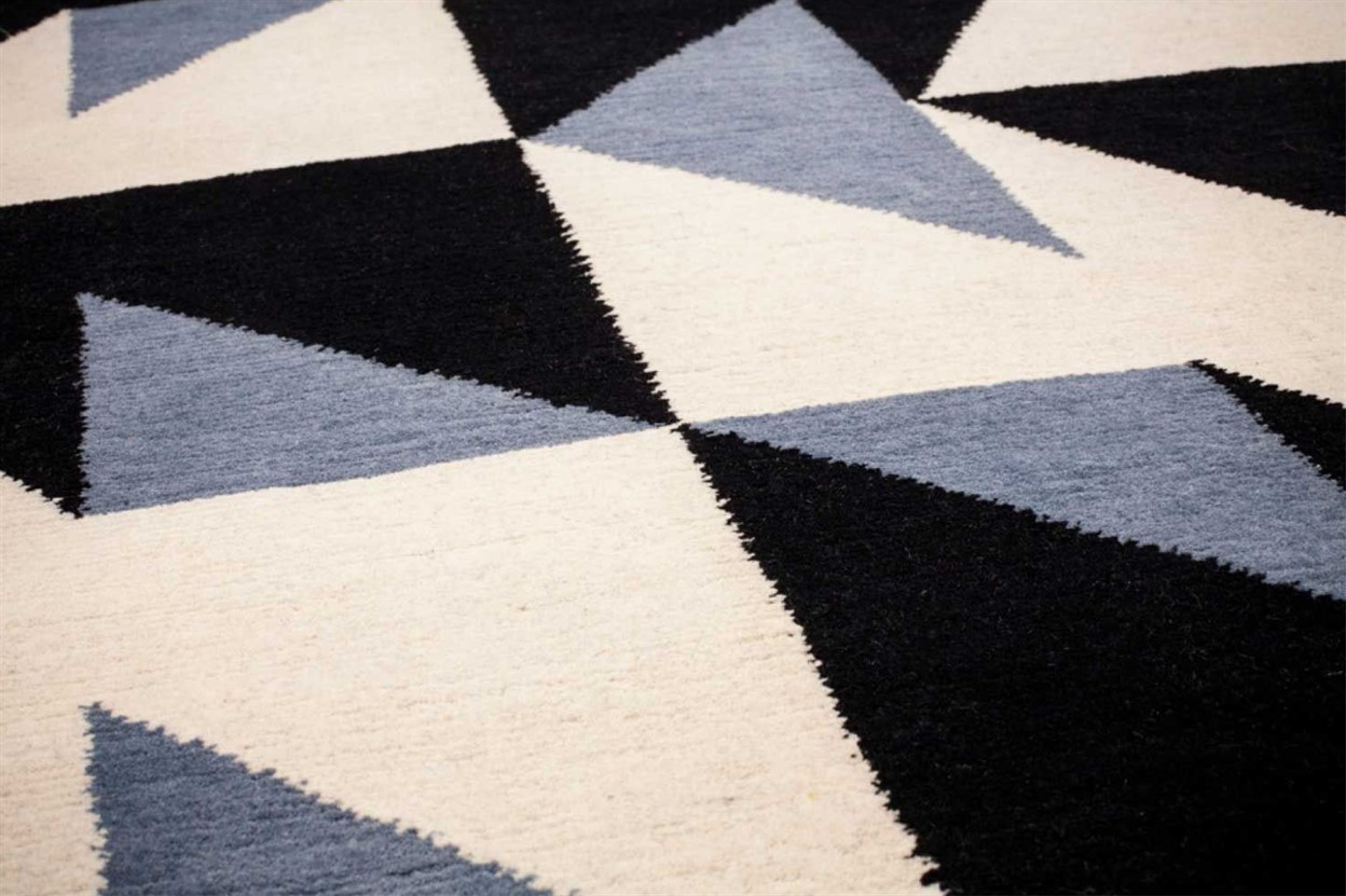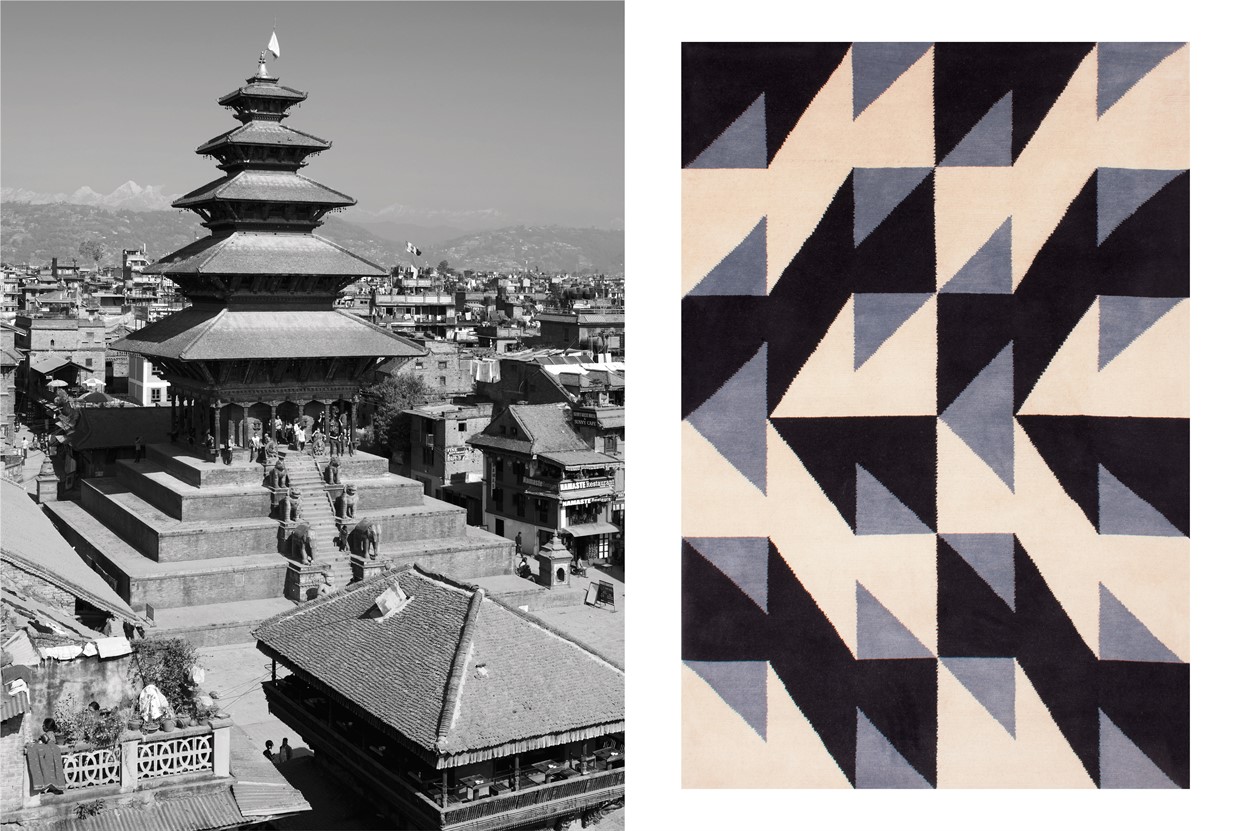 The bold monochrome pattern designs ‘ALOFT’ and ‘SUNSTRIPE’ paid tribute to the traditional drying techniques where the rugs are arranged in neat lines atop the angular Nepalese rooftops. The pattern for ‘ALOFT’ was based on the Nepalese flag shaped like two pennants – the only flag in the world that isn’t a square or a rectangle. The flag’s jagged triangular motif was flipped and repeated to reveal another iconic shape seen in the rooftops of traditional architecture.