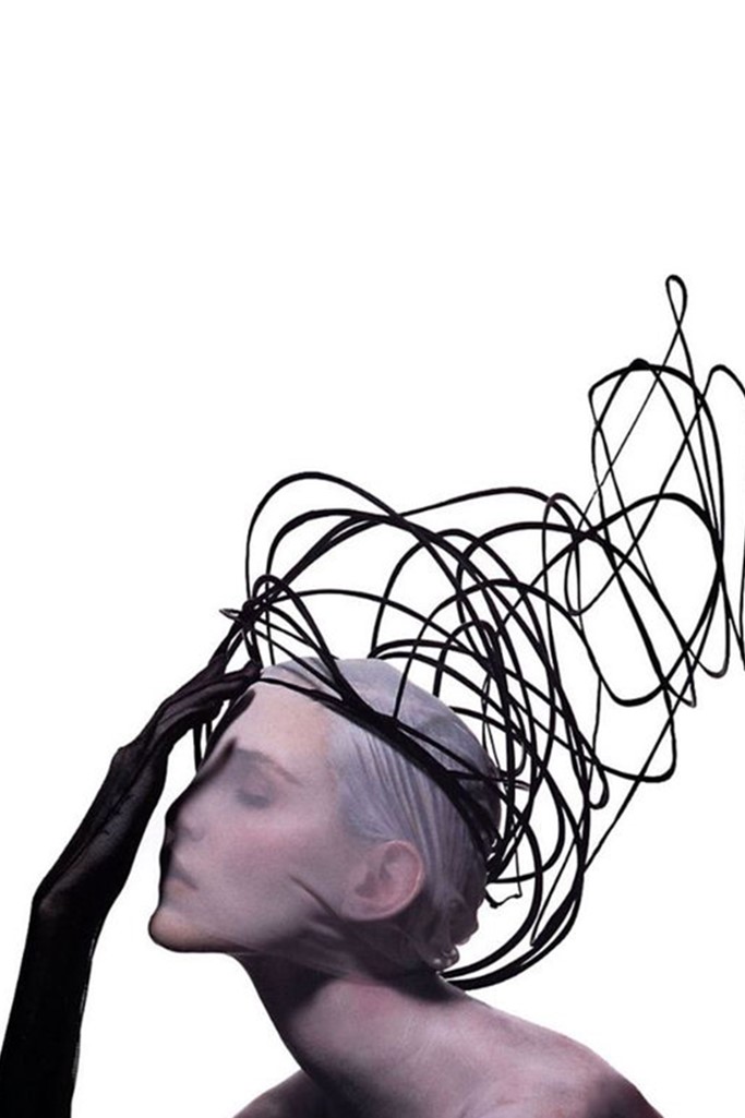 A delve into the PATTERNITY Archives reveals a swirling, spiral headpiece. Nadja Auermann photographed by Irving Penn for Vogue, 1996. Hat by Phillip Treacy