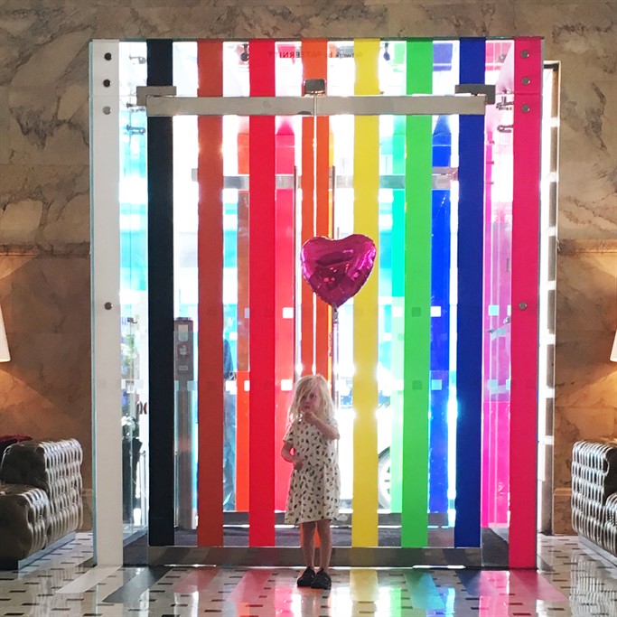 Lovely little Willow (Anna's niece) explored our interior installation at the Edition Hotel London. Guests entered the hotel through a rainbow arc of stripes for a party...