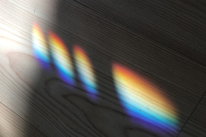 A chance ray of sun burst through a prism of glass in the studio to create this perfect rainbow. We love to capture the fleeting and ever changing patterns of our day…