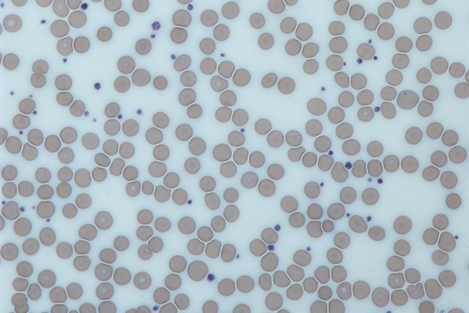 Image from a light microscope (500 ×) from a Giemsa-stained peripheral blood smear showing platelets (blue dots) surrounded by red blood cells (pink and circular)