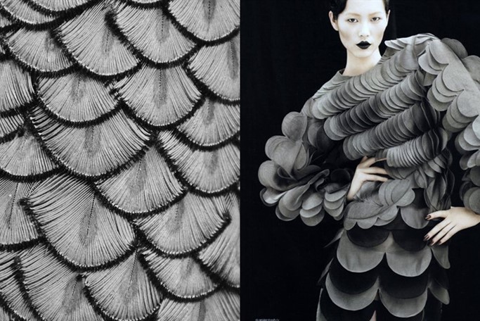 Discover similarity in form and texture Left: Feathery Formation by Michael Fitzsimmons Right: Semicircular Ensemble by Daniel Jackson for Vogue China