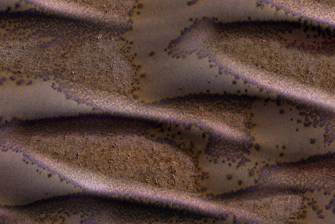 These velvet textured folds are actually frozen sand dunes on Mars. Spots form when the sun begins to heat the land during the winter months, causing carbon-dioxide to...